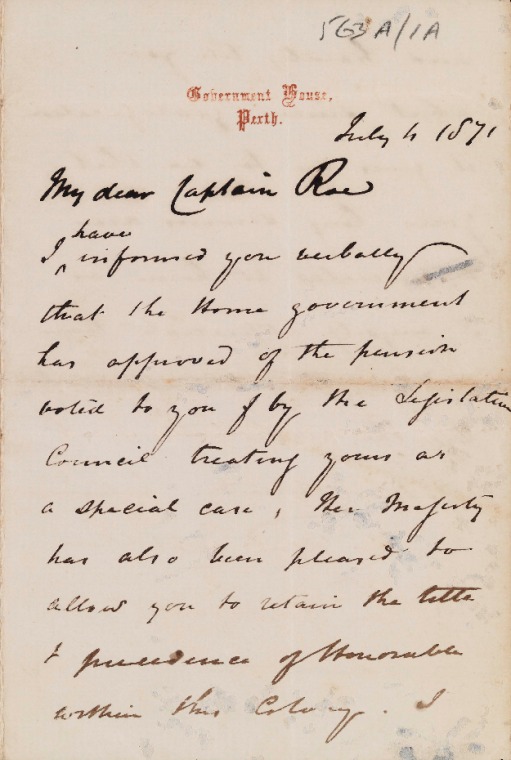 ACC 563AD/1A: 4 July 1871, Government House. Frederick Weld Captain Roe. Approval of pension
