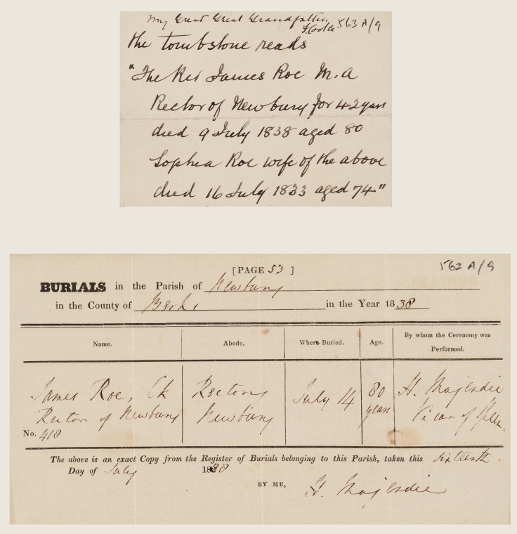 ACC 563AD/9.4: Register of Burials. Sophie Roe; Revd James Roe + tomb inscription