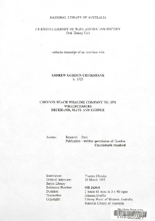 OH2634/9: Transcript. Interview with Andrew Gordon Cruickshank, whaler interviewed by Yvonne Choules