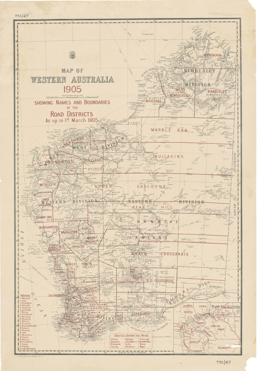 Map of Western Australia showing names and boundaries of Roads Board Districts in red, 1905.