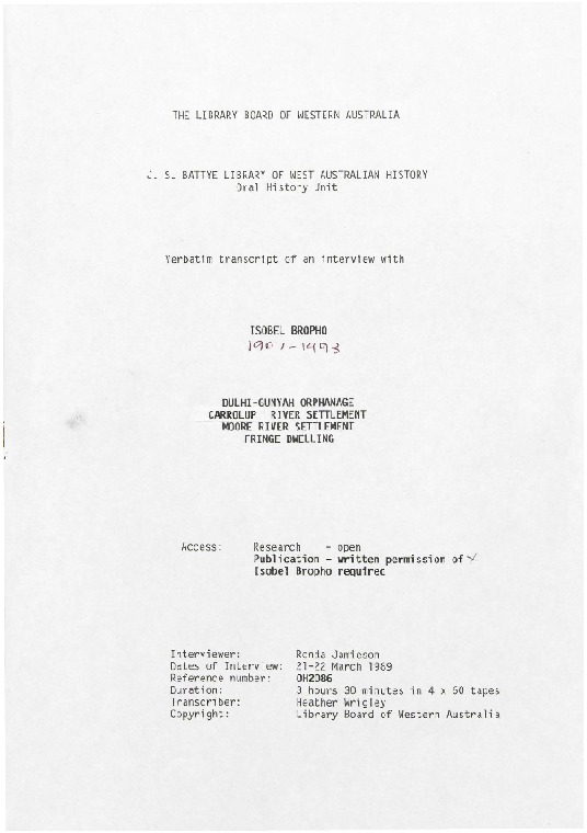 Transcript. Interview with Isobel Bropho / by Ronda Jamieson