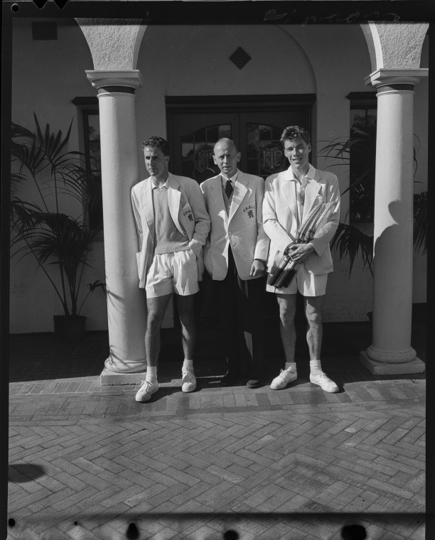 242534PD: L-R: Philippe Washer, P. Geelhand De Merxem (Manager) and Jacques Brichant, Belgian Davis Cup team at Royal Kings Park Tennis Club, 2 December 1953