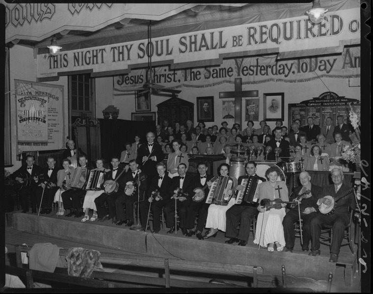242425PD: The Elim Orchestra and the Elim Choir at a revivalists meeting with American evangelists Elmer and Jean Darnell held at the Elim Foursquare Gospel Church, Mt Lawley, 2 Oct. 1953