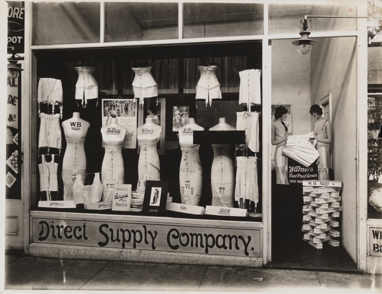 BA533/128: Corsets on display at the Direct Supply Company (Miss A. Kyle, corset specialist), Bairds Arcade, Perth, 1915