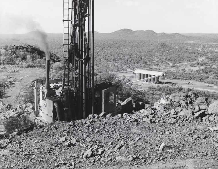 BA875/49: Iron ore quarry at Koolyanobbing showing crushers and loaders with new town in the distance, ca. 1969.