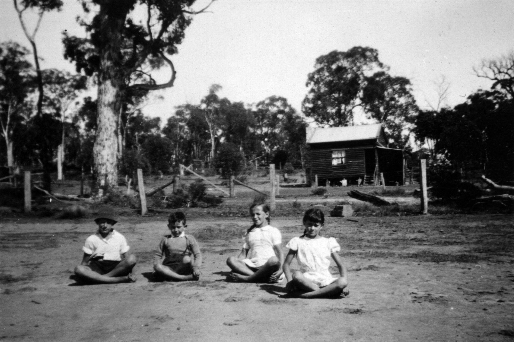 005669D: Students seated on ground. (L to R) Bobbie Ritchie, Jimmy Ritchie, Maisie Corker and Mavis Bignell North Kulikup School in the background