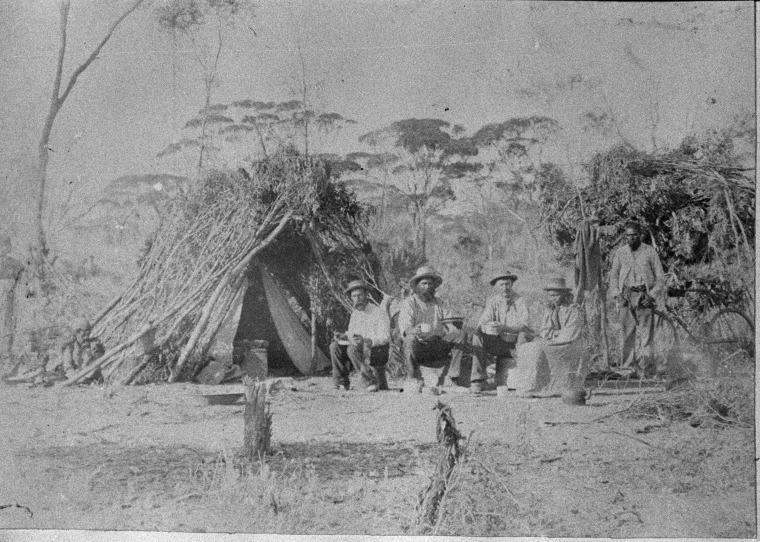066365PD: A fencing party 'outback' in W.A., 1897. The man seated 2nd from left is Henry Dimer and the woman is Topsy Whitehand who he married in 1899