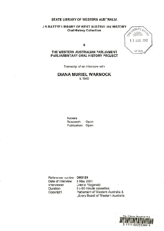 OH3129: Transcript. Interview with Diana Muriel Warnock, politician interviewed by Criena Fitzgerald..