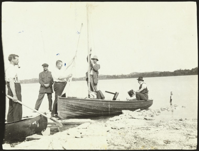 BA1271/36: L-R: E.L. Mitchell, Harold Boas, A.J. Burgess and Abe Herman with the Lake Preston Lodge camp boat and canoe, ca.1914