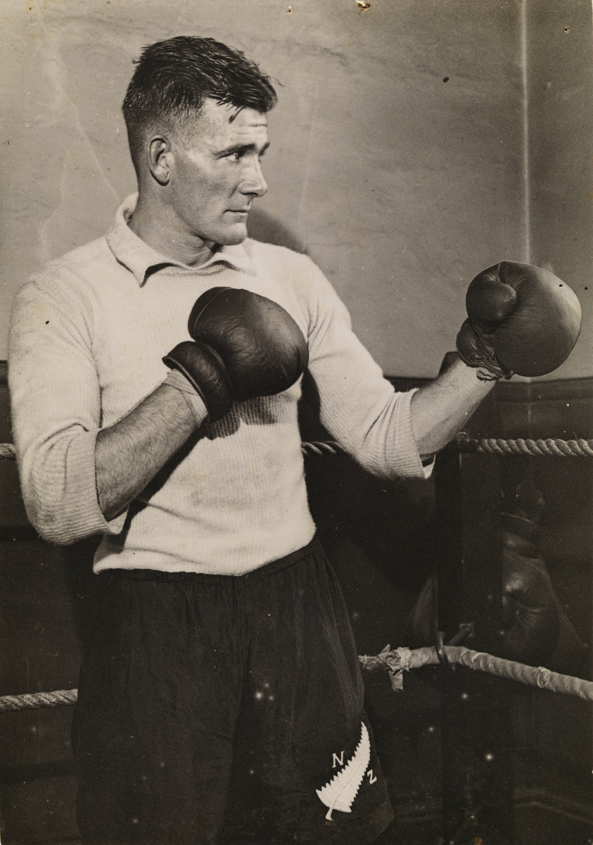 BA1493/12: A boxer in the New Zealand team for the 1936 Olympics with boxing gloves on, standing in a boxing ring.