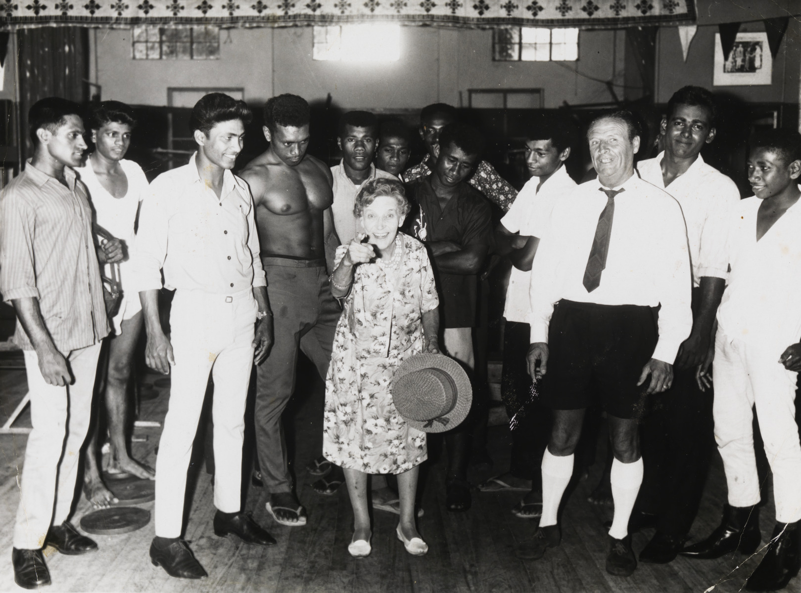BA1493/19: Effie Fellows in a gymnasium in Suva, Fiji, surrounded by young Fijian boxers and onlookers, 1968.