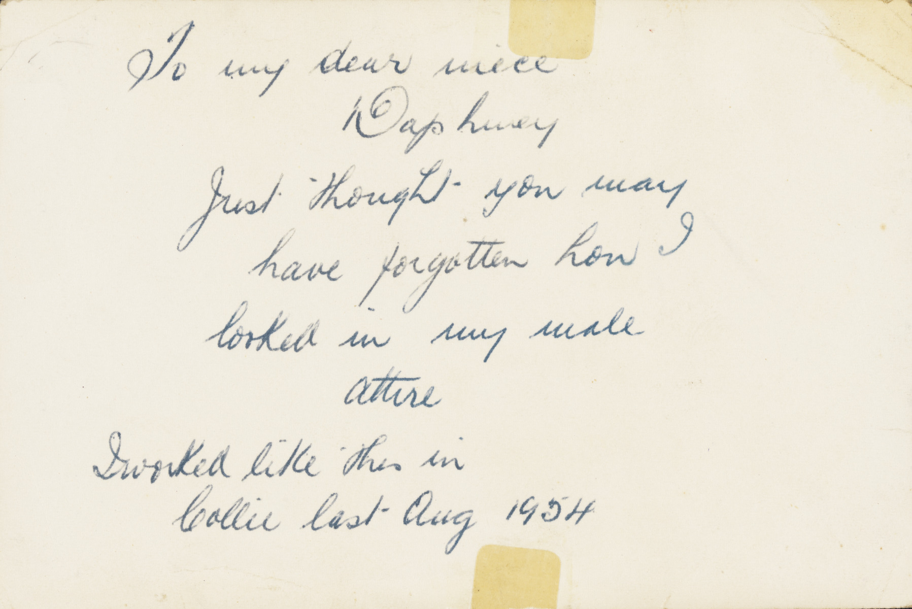 BA1493/6 verso: Studio portrait of Effie Fellows, in costume of top hat and tails portraying Bobbie Folson, 'Australia's Boy/Girl'.