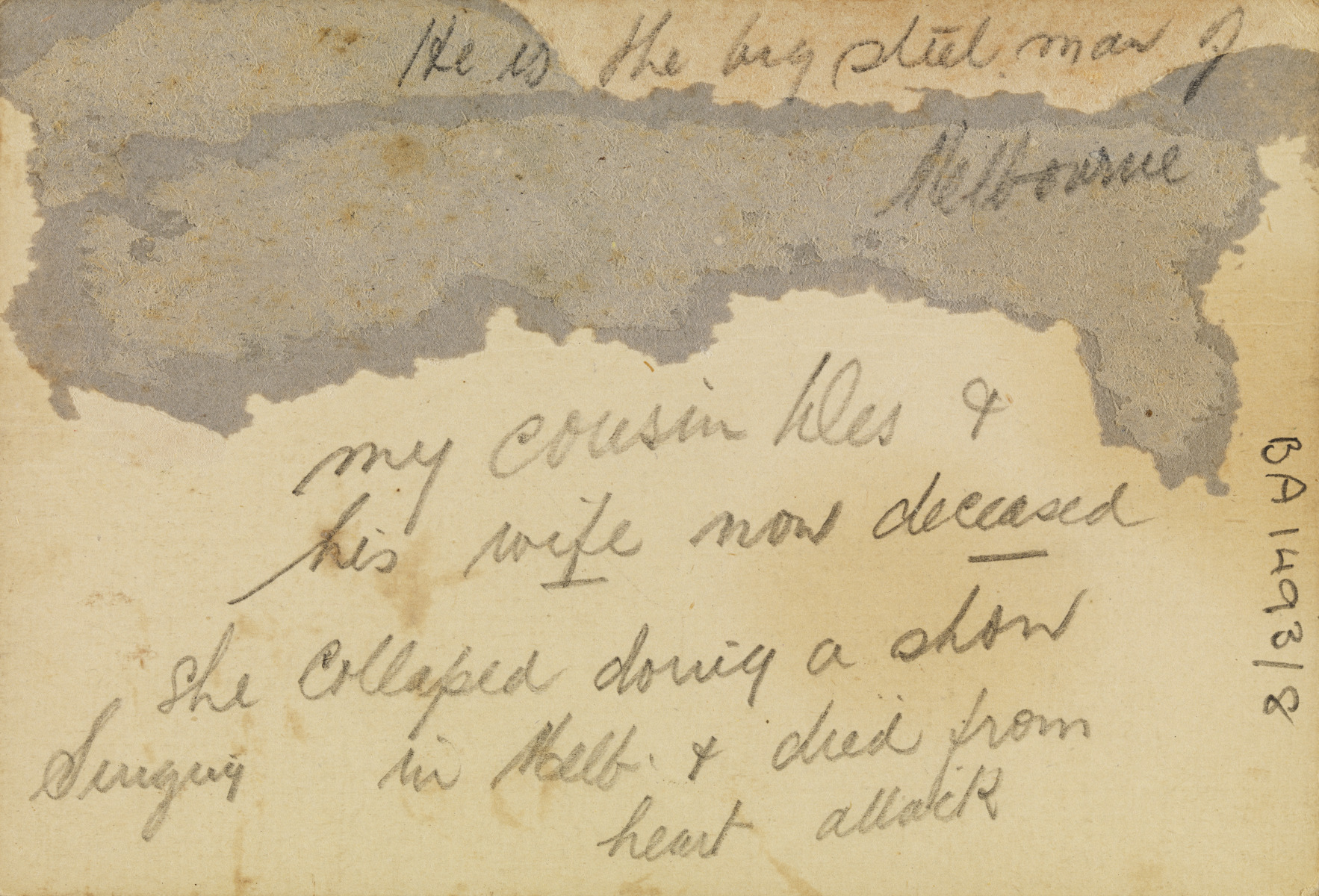 BA1493/8 verso: Bride and groom on their wedding day. The groom, Des, is a cousin of Effie Fellows.