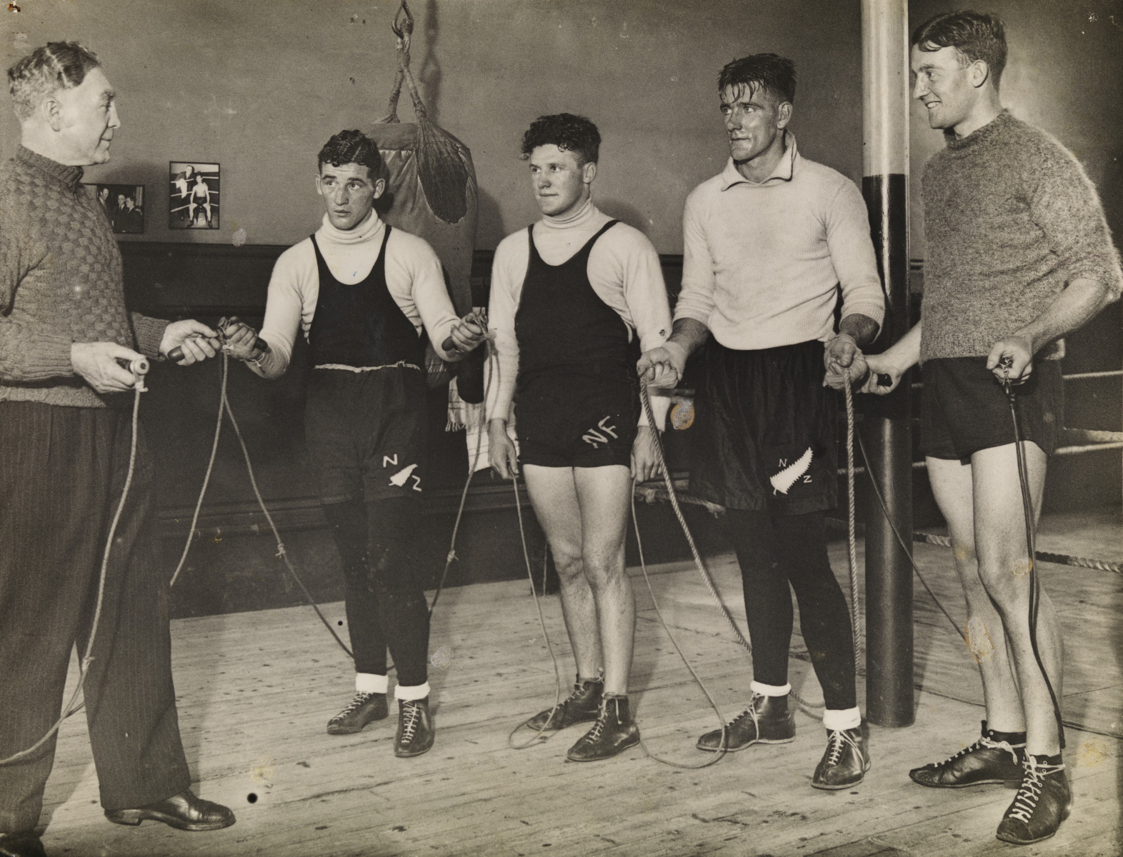 BA1493/9: Five men with skipping ropes in a gymnasium, of which Sam Chapman on the far left, is the coach, 1936.