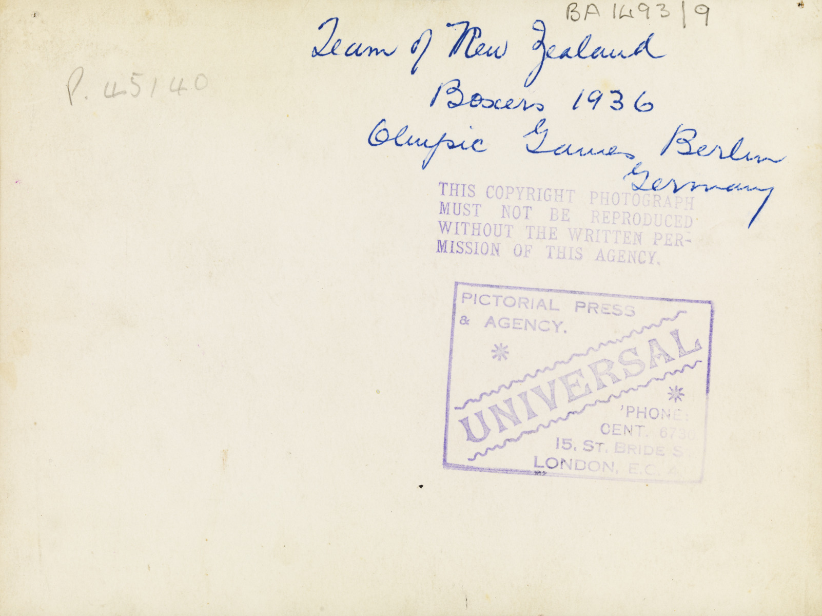 BA1493/9 verso: Five men with skipping ropes in a gymnasium, of which Sam Chapman on the far left, is the coach, 1936.