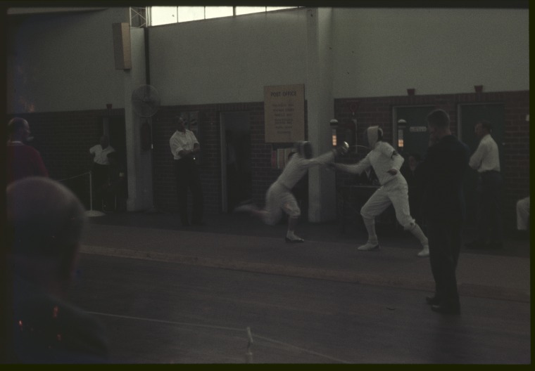 149023PD: Fencing at the Drill Hall in Victoria Park. In the background a sign for Post Office Branch No.3 VIIth British Empire and Commonwealth Games, 1962