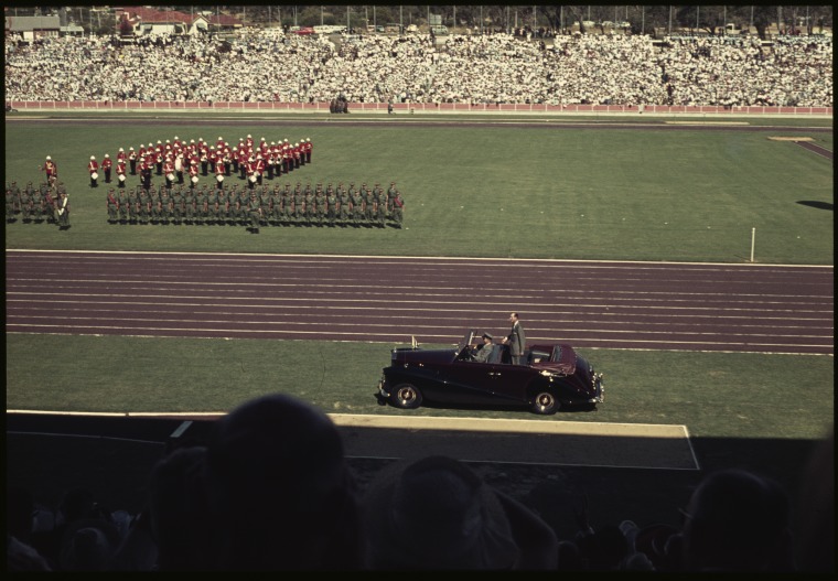 149008PD: The Duke of Edinburgh (standing in open car) arrives at the opening ceremony, 22 November 1962