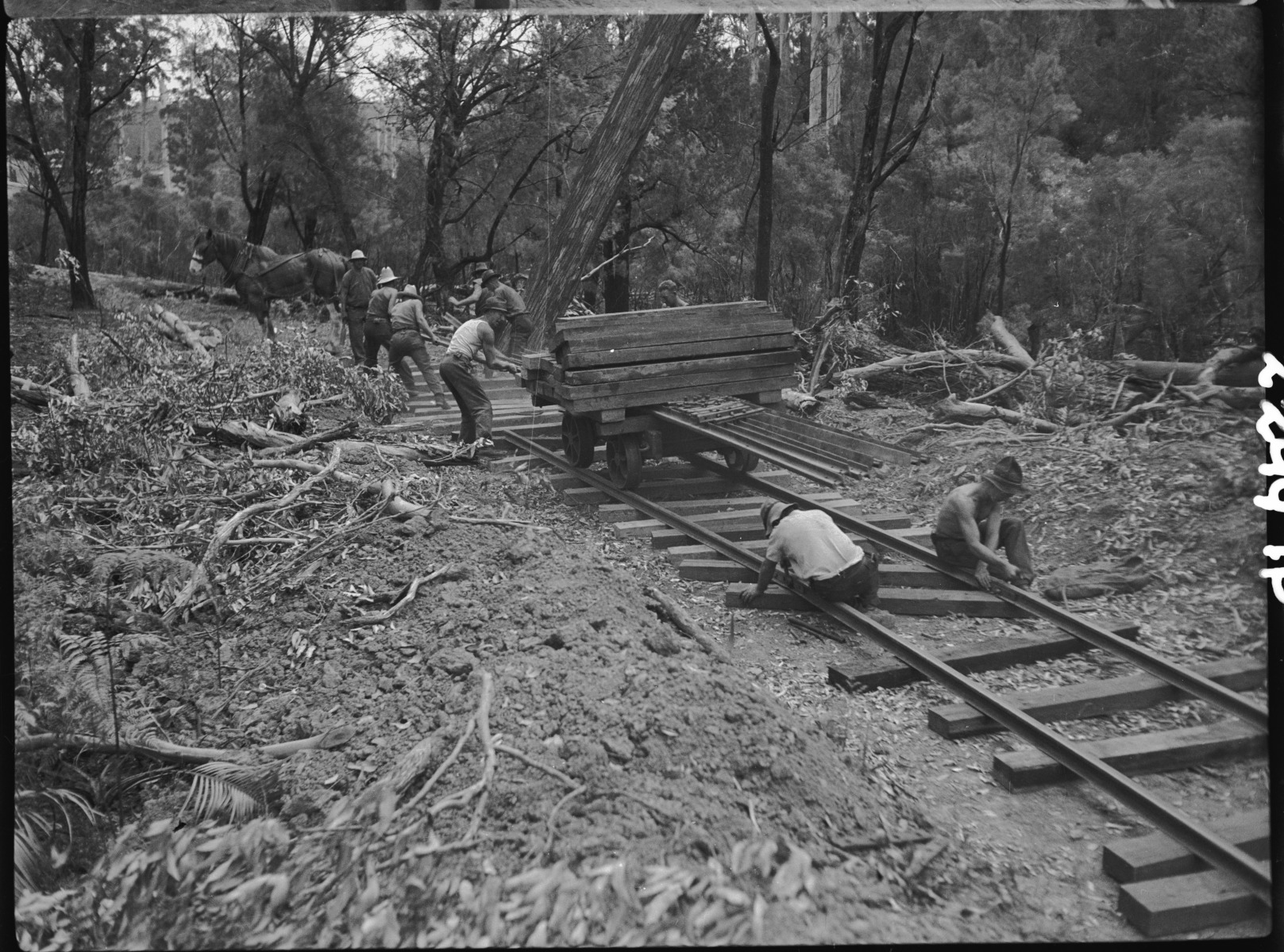 022997PD: Loggers hauling cut timber on a railway track, while others perform repairs, South-West, 1930s?Building railway track, 1930s?