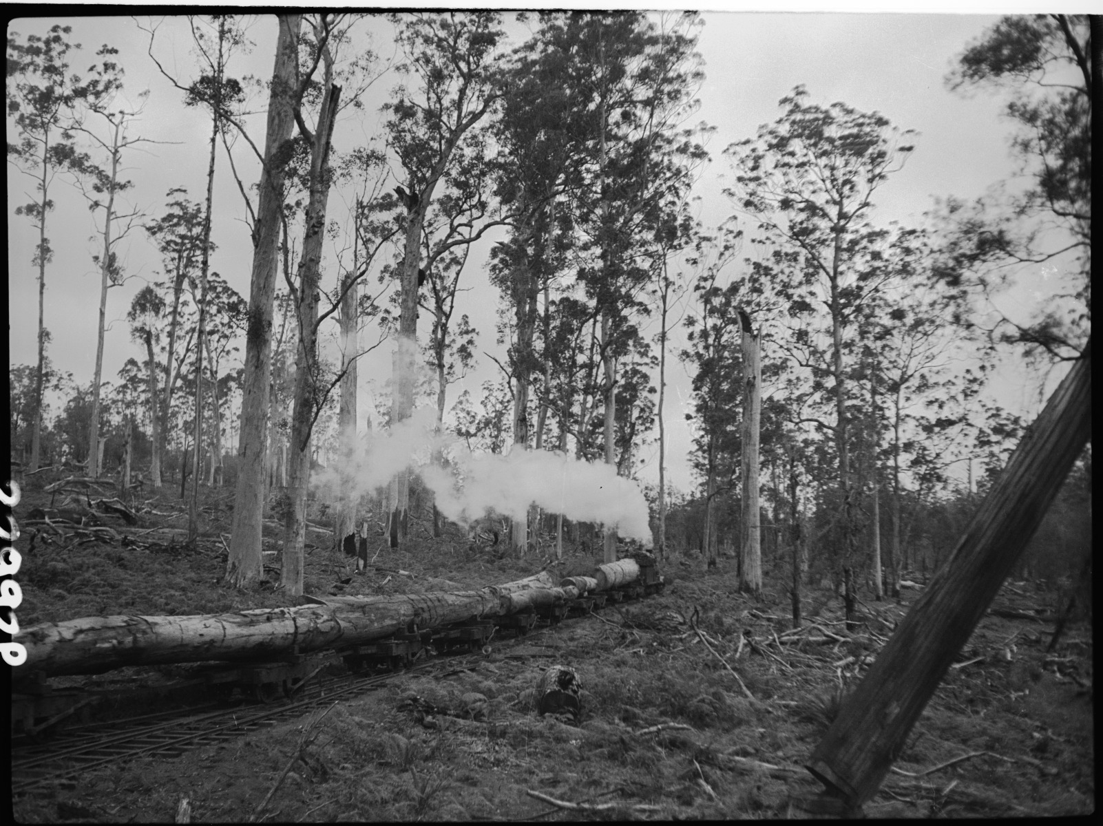 022992PD: Steam locomotive hauling large felled tree through a forest, South-West, 1930s?