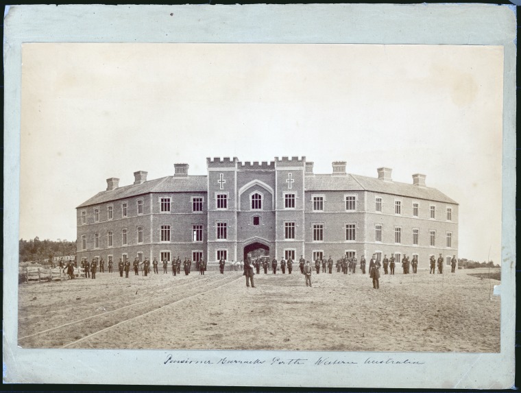 303442PD: Soldiers in formation in front of the Pensioner Barracks, Perth, c1866