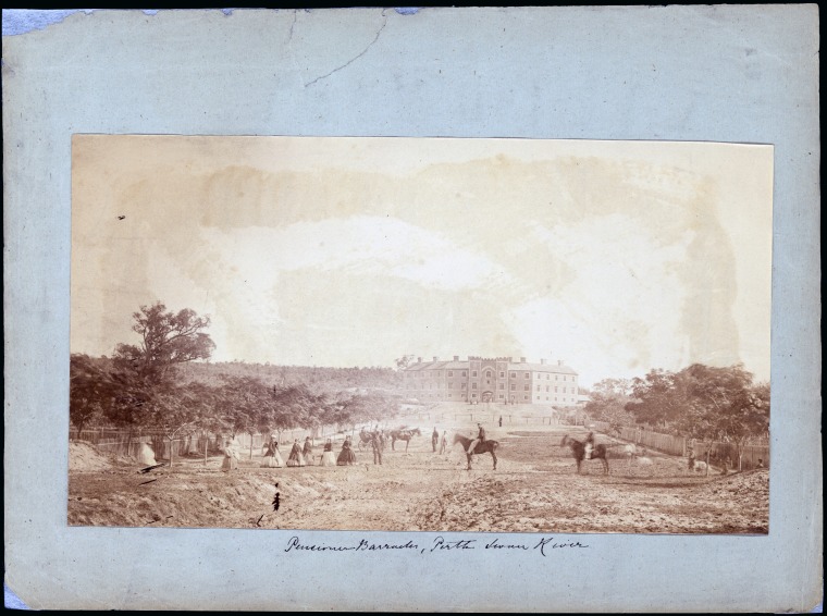 303443PD: Pensioner Barracks viewed down a concourse with groups of people, two mounted men and a horse and buggy in the foreground, c1866