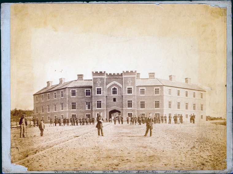 303445PD: Soldiers standing in front of the Pensioner Barracks, c1866