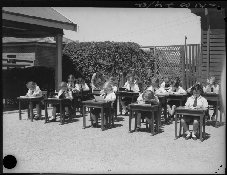 016126PD: At their desks in the grounds of Perth College, Mt Lawley, 26 February 1941