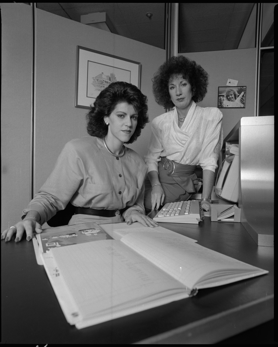 325216PD: Margaret Woodall and Grace Papa in Acton Staff Management office, City Arcade Office Tower, Perth, ca. 1985.