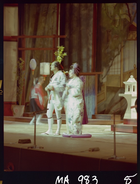 320215PD: Dennis Olsen (Ko-Ko); Thomas Edmonds (Nanki-Poo); June Bronhill (Yum-Yum) in 'Mikado', 1977