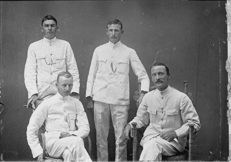 066204PD: Four soldiers. Standing left identified as William Alfred Telford killed in action at Gallipoli 28 June 1915, 1914-1915