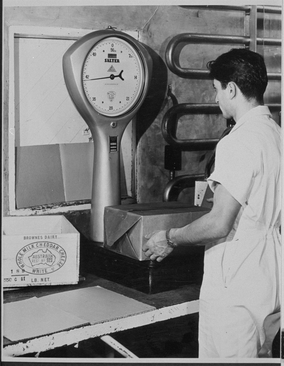 128267PD: Weighing cheese, 1950s?