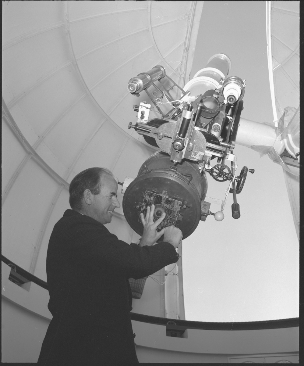 280527PD: Astronomer Dr Mike Candy at the Perth-Lowell telescope demonstrating the photographic glass plate 1971