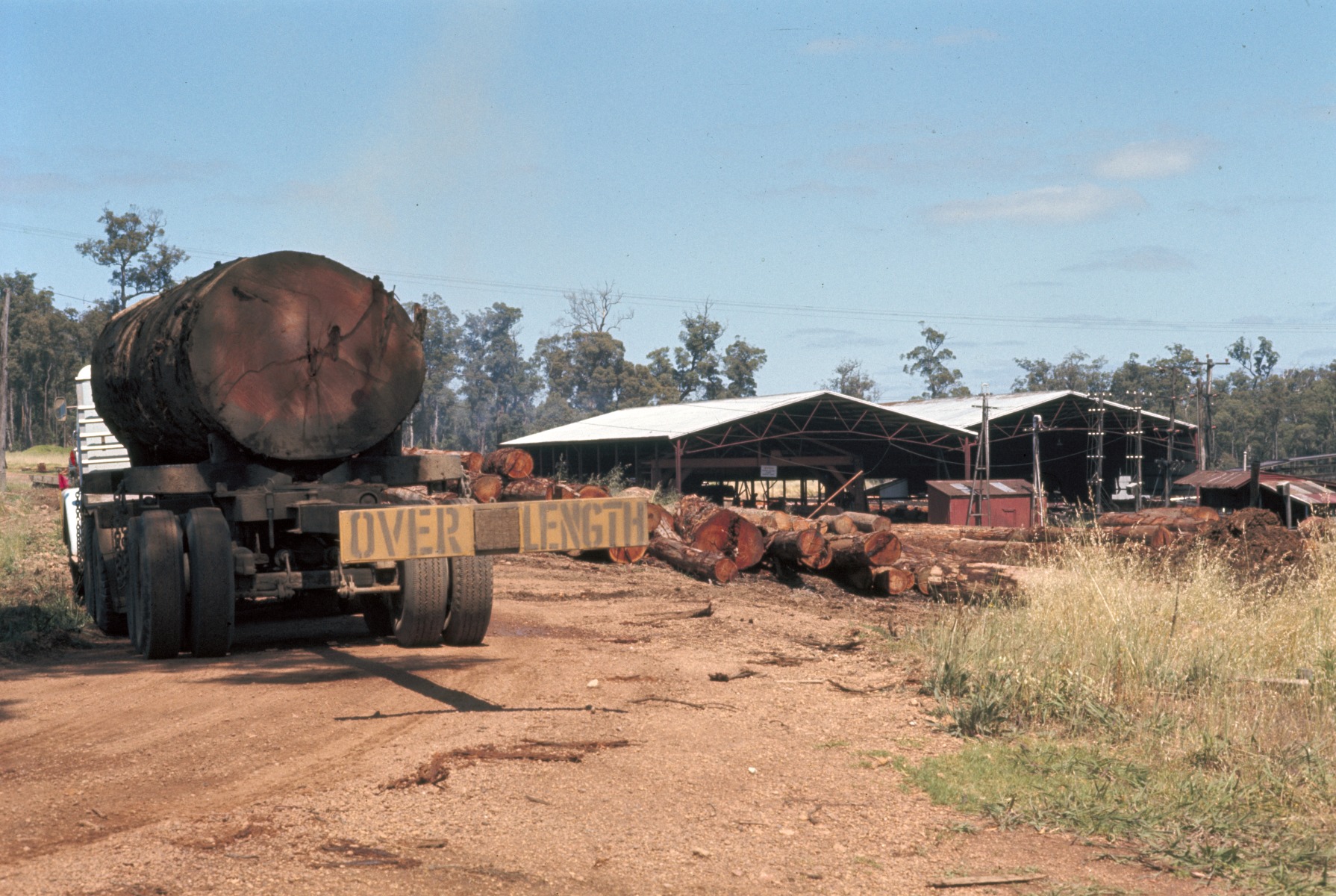 078556PD: A log truck arriving at Jardee timber mill, ca. 1980