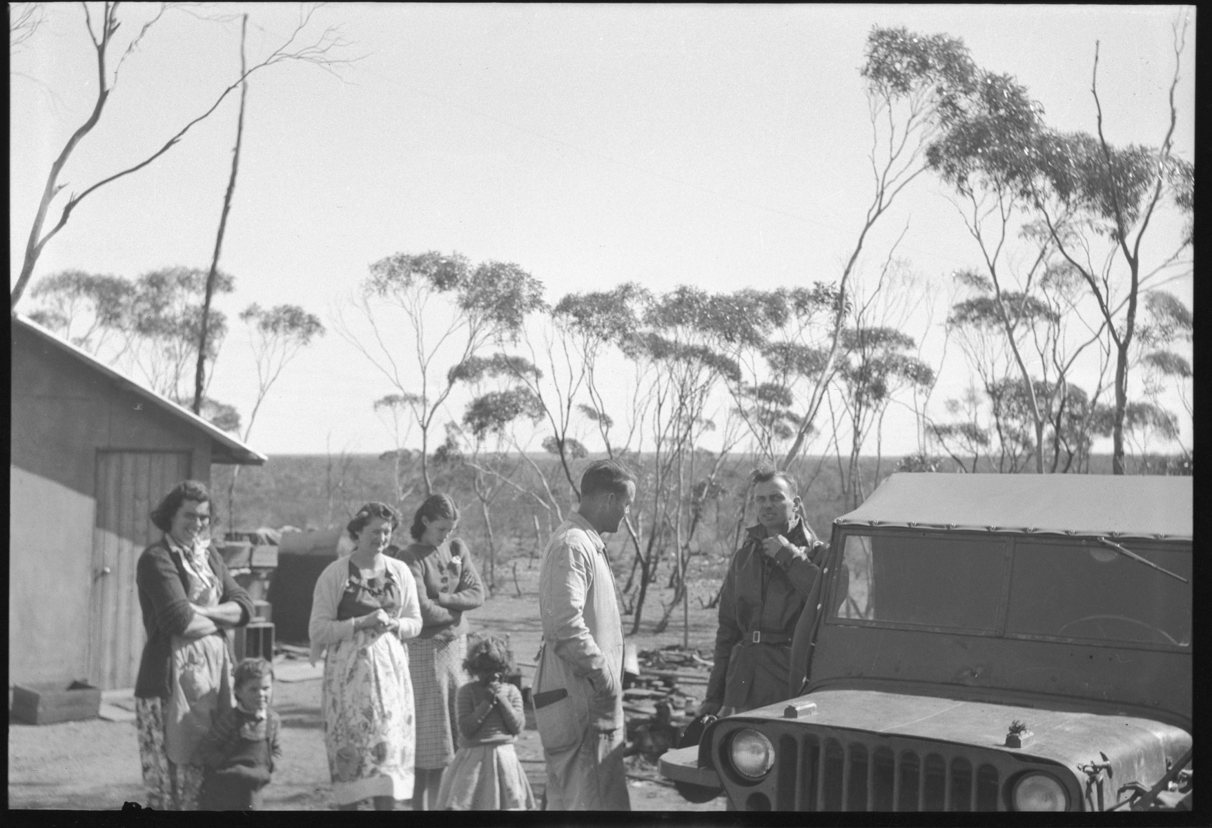 219916PD: Heading bush to look for Aboriginal relatives, 1954. Betty McKeich, Doris Anderson, Darlene Stewart, Bob Stewart, Bert Anderson