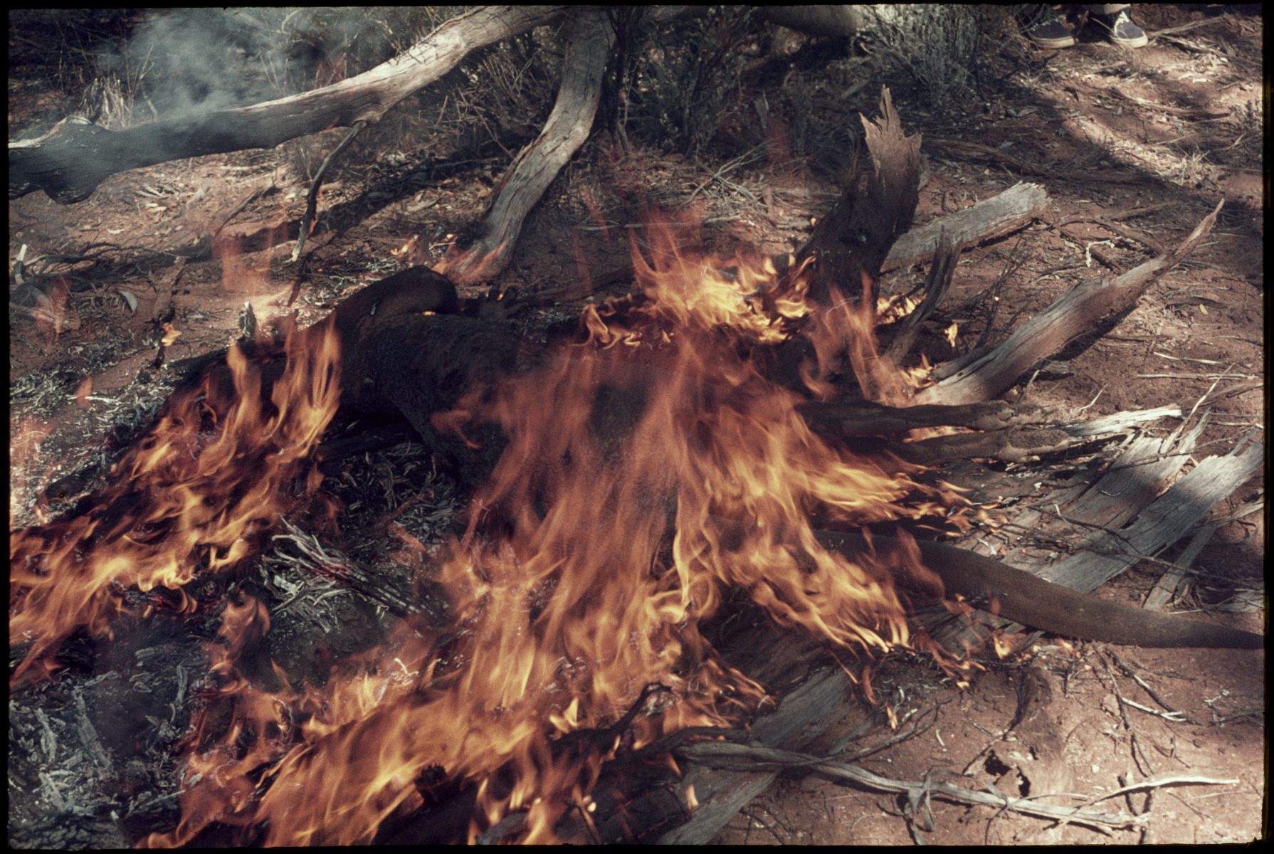 134266PD: Tjurpula Jamieson killing, butchering and cooking a kangaroo in a campfire near Cundeelee, 1977. Cooking