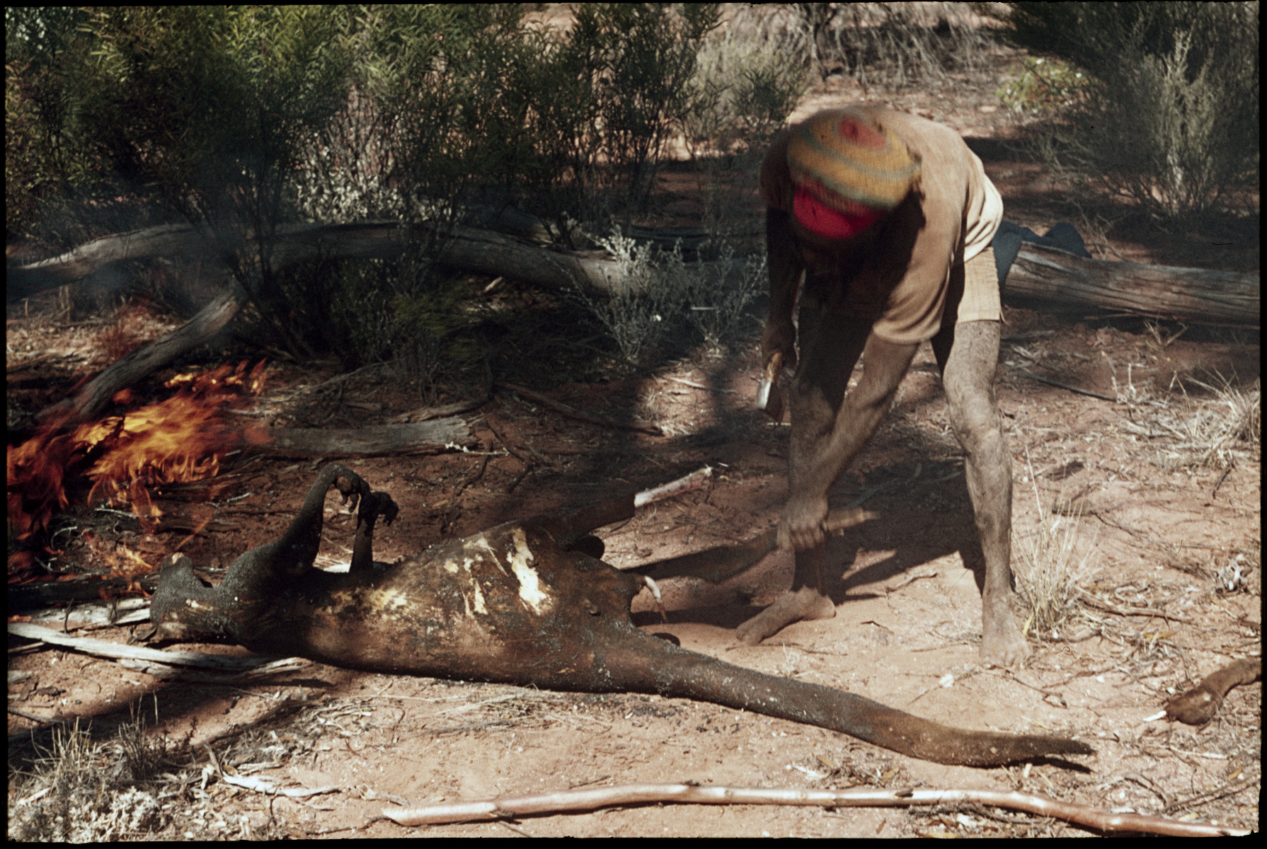 134268PD: Tjurpula Jamieson killing, butchering and cooking a kangaroo in a campfire near Cundeelee, 1977