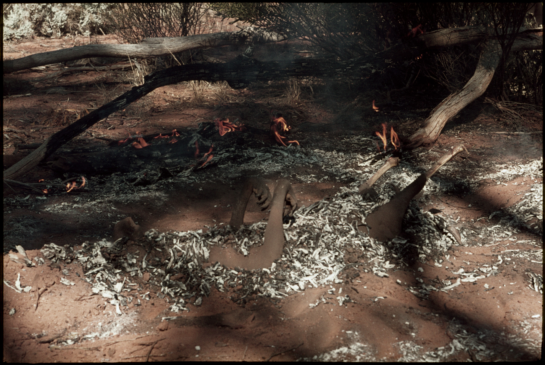 134270PD: Tjurpula Jamieson killing, butchering and cooking a kangaroo in a campfire near Cundeelee, 1977