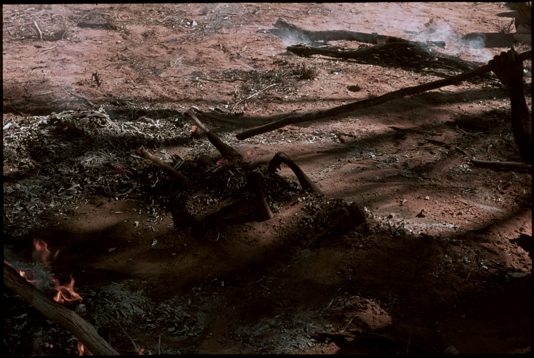 134273PD: Tjurpula Jamieson killing, butchering and cooking a kangaroo in a campfire near Cundeelee, 1977