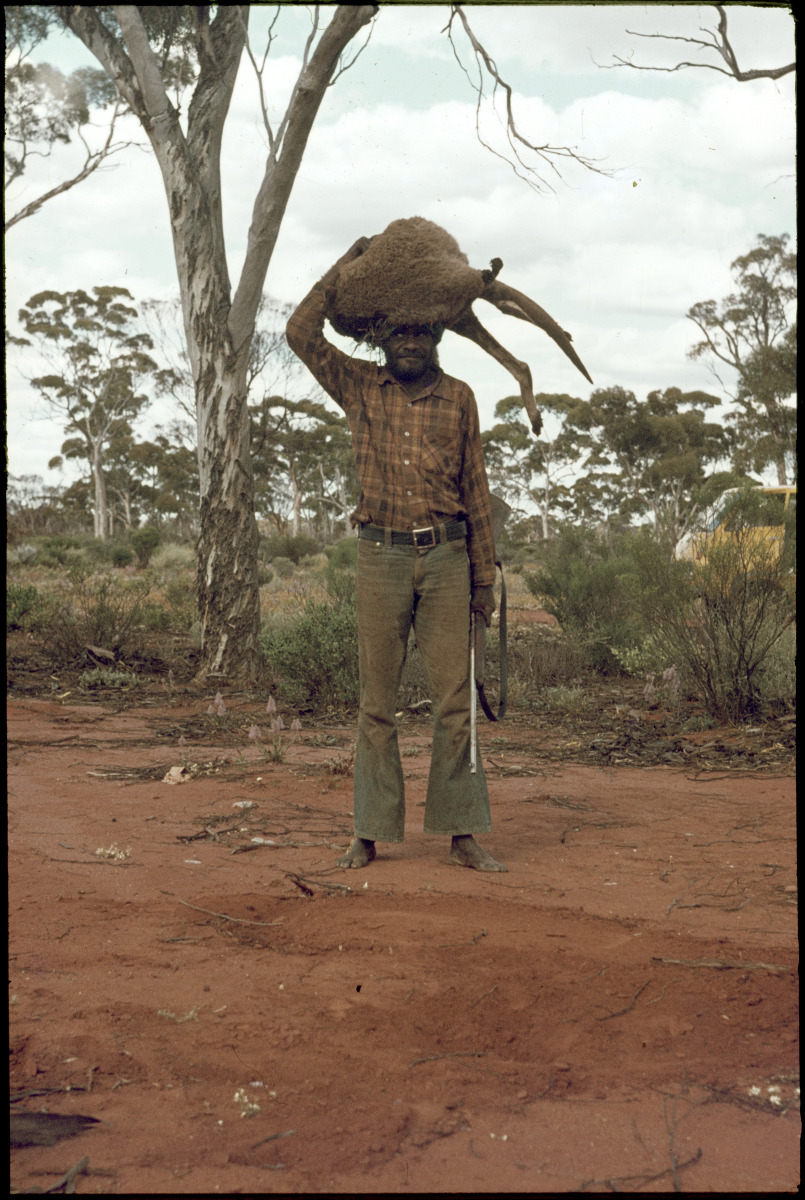 134256PD: Tjurpula Jamieson killing, butchering and cooking a kangaroo in a campfire near Cundeelee, 1977. First kill your kangaroo