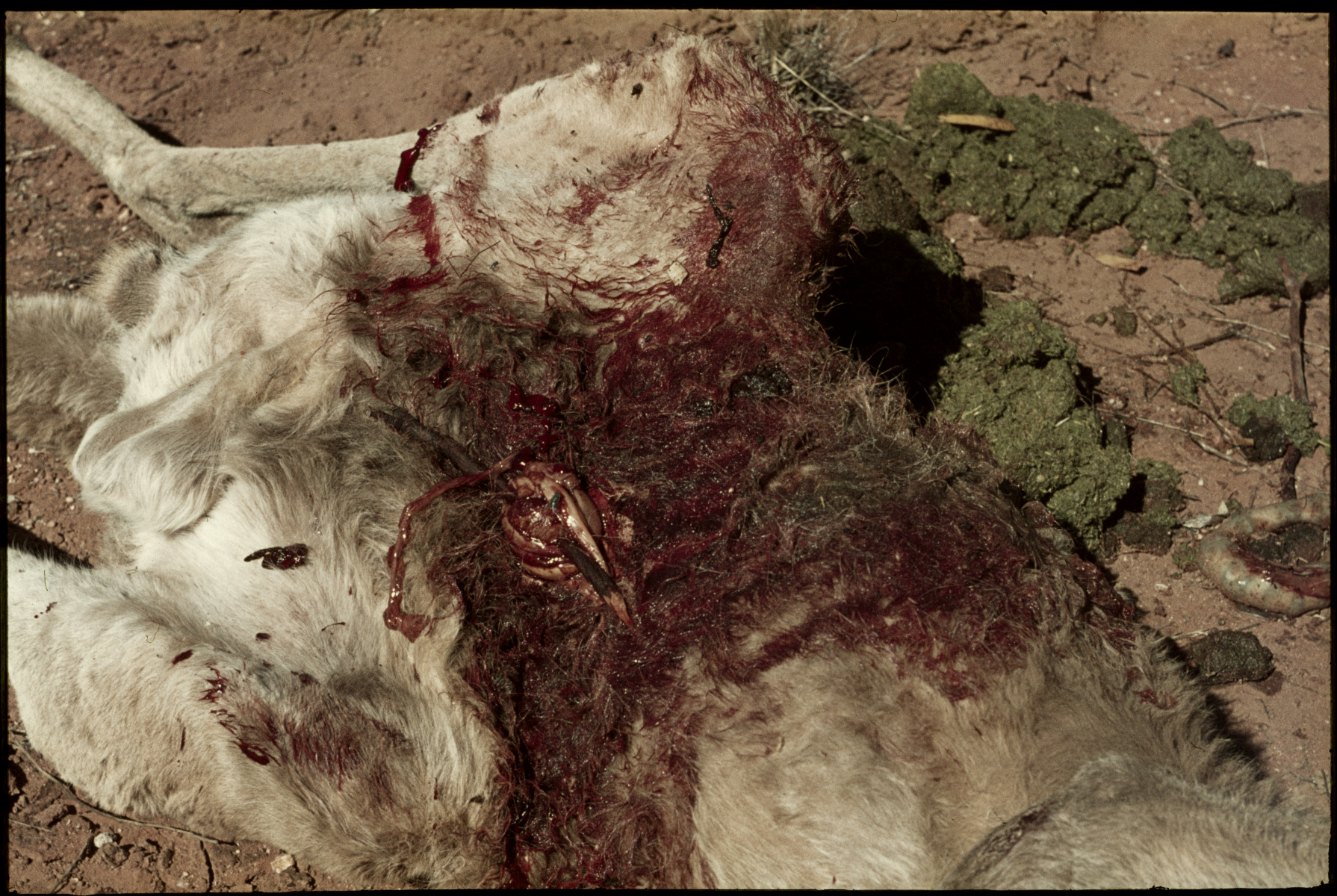 134262PD: Tjurpula Jamieson killing, butchering and cooking a kangaroo in a campfire near Cundeelee, 1977