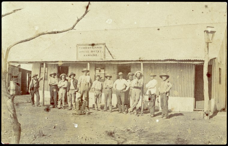 209922PD: Tombs & Dinnis Royal Hotel, Nannine. J. T. Finch leaning on pole 3rd from right, ca. 1892