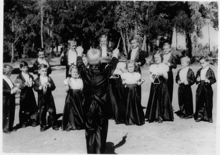 1h. Photograph of Percussion Band 2 - trained by May Holt. Eileen Gould third from left front row - tambourine. June Gould front row right hand side - triangle.