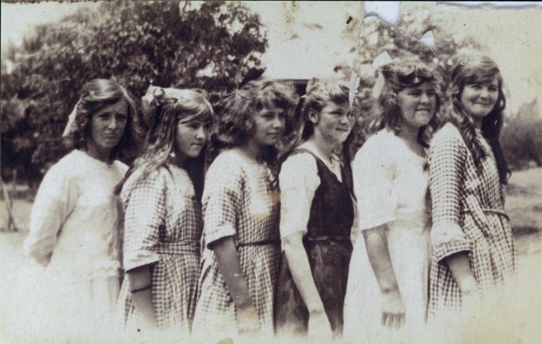 1b. 6 girls - Caroline Benson (called Carleen at home) first right (June Gould, Brian and Eileen's mother); Ethel Nation next to Caroline; 4th right May Holt as a young girl