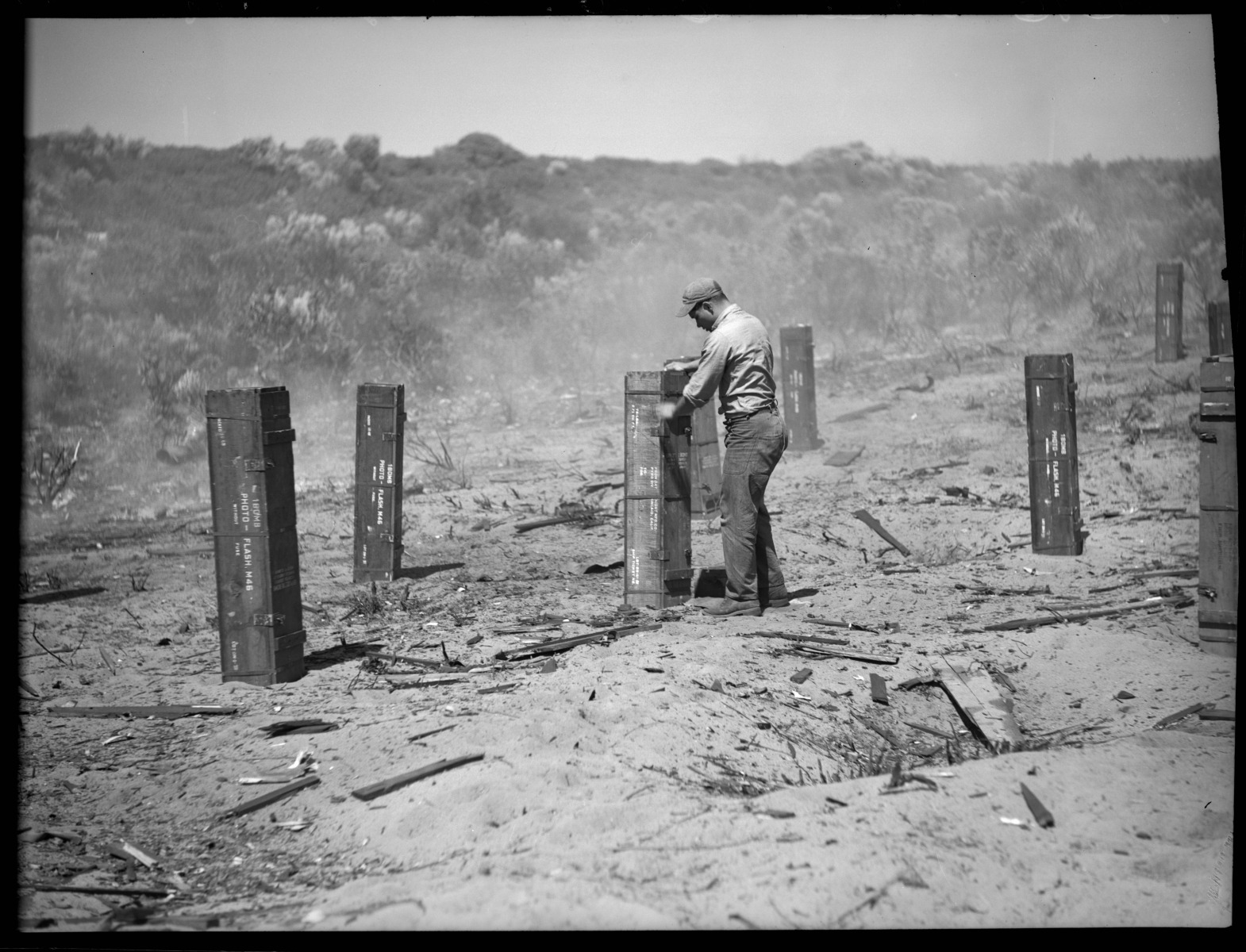 110251PD: Bomb disposal at Swanbourne Rifle Range of surplus photoflash bombs used by the U.S. Navy aircraft for night photography, 27 December 1945
