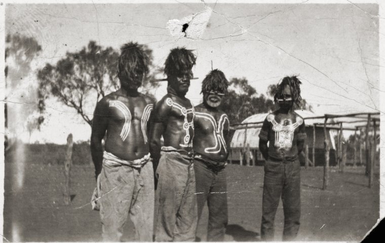 BA2184/8: "Taken when Shirley a baby, some of the Yamagee men at Moorarie Station. Aboriginals at Meekathara, they do not like to be called blacks", ca. 1920.
