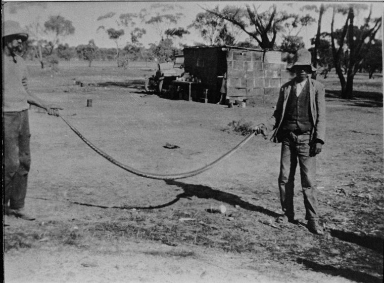 060940PD Charlie Winmar and Sam Williams holding a long snake caught at Badjaling in the late 1920s. A camp is in the backgroound.