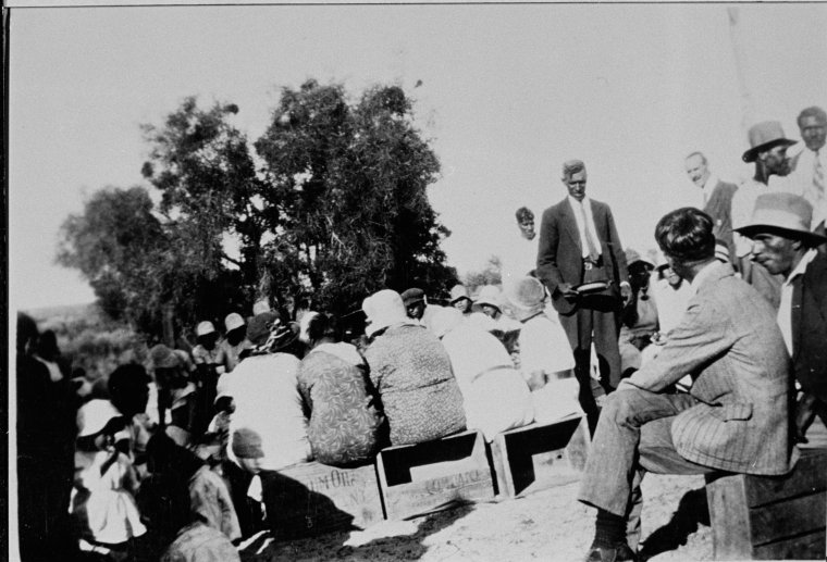 060926PD A church meeting at Badjaling in the late 1920s. Includes Charlie Winmar (collecting the offering), Lionel Yarran, Perry Jackson and Cyril Yarran