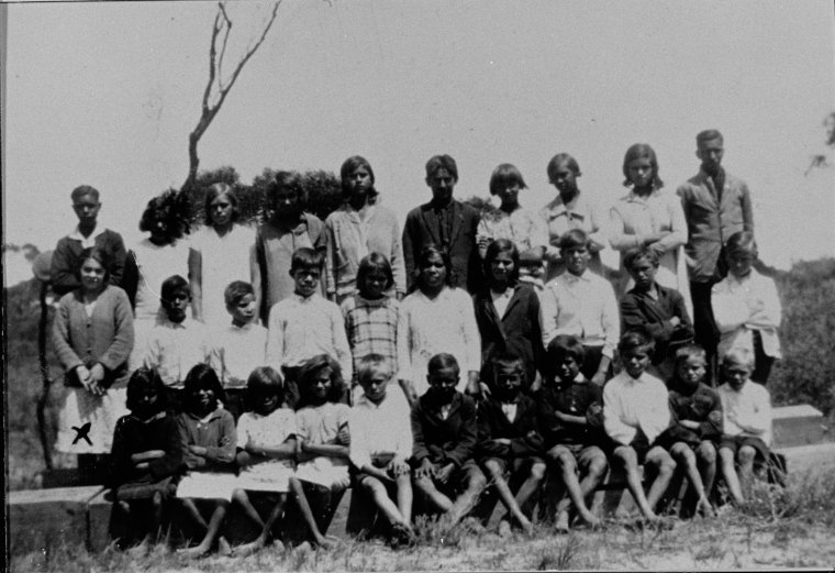 060938PD Group of Badjaling school children, including John Winmar (back far left), Sheila Garlett (back 3rd from right), Fred (Jock) Winmar Jnr (back row far right) and Len Garlett (3rd from left middle row), in the late 1920s