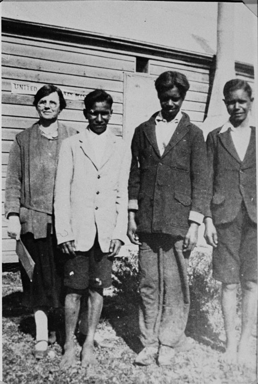 060927PD Left-right: Miss Mary Belshaw, Fred Winmar Jnr. (Jock), Andrew Pickett (gun shearer) and John Winmar outside Badjaling mission house in the late 1920s