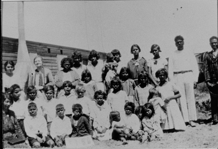 060929PD Group photo taken in the late 1920s outside the Badjaling mission house. Back row L-R: Mrs Beth Douglas, Miss Mary Belshaw, Mary McKay, unknown, Edna Winmar, unknown, unknown, Pearlie Websdale, Sheila Garlett, Lionel Yarran, unknown; Middle: unkn
